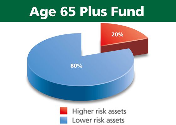 Eventually, all accrued benefits and new contributions (including transferred-in monies) will be invested in the Age 65 Plus Fund when the member reaches the age of 64.