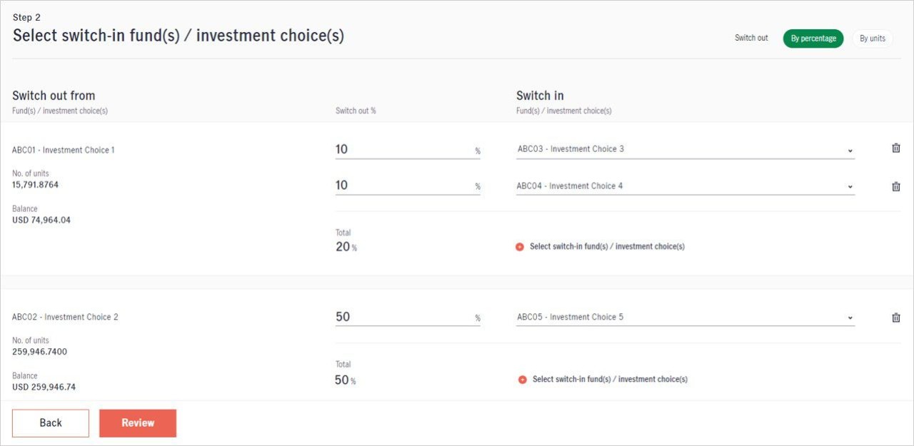 Step 2: Select the switch out option, the fund(s) / investment choice(s) you would like to switch in and input the switch out % / unit, then click “Review”.