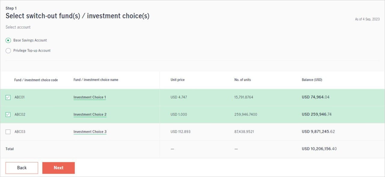 Step 1: Select the account (if applicable) and the fund(s) / investment choice(s) you would like to switch out, then click “Next”.